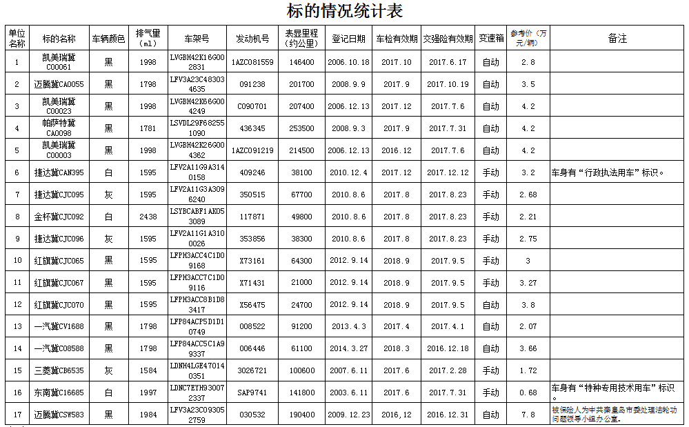 根據(jù)秦皇島市公務(wù)用車改革要求,受相關(guān)部門(mén)委托,河北如意山海拍賣有限公司定于2016年11月14日上午9:30時(shí)通過(guò)中國(guó)拍賣行業(yè)協(xié)會(huì)網(wǎng)絡(luò)拍賣平臺(tái)(http://pm.caa123.org.cn)對(duì)“秦皇島市機(jī)關(guān)公務(wù)用車制度改革第三批車輛”進(jìn)行公開(kāi)拍賣。