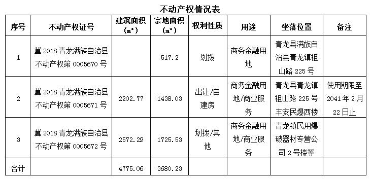標(biāo)的坐落于青龍滿族自治縣青龍鎮(zhèn)祖山路225號(hào),北臨金屬小區(qū),南至祖山路,東臨地稅局家屬樓,證載權(quán)利人為秦皇島市豐安民用爆破器材有限公司,標(biāo)的總參考建筑面積4775平方米,建成于2009年,房屋結(jié)構(gòu)為混合結(jié)構(gòu),無(wú)電梯,簡(jiǎn)單裝修,總層數(shù)為7層,地上6層,地下1層。水、電、暖齊全,標(biāo)的參考占地面積3680平方米(詳見下表),標(biāo)的的土地界點(diǎn)詳見宗地圖。樓內(nèi)空調(diào)不在拍賣范圍之列,具體以現(xiàn)場(chǎng)實(shí)物為準(zhǔn)。